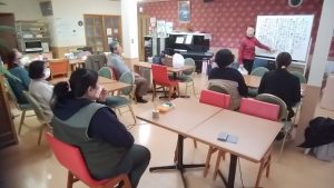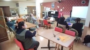 みなさん、ウォーミングアップの後、楽器演奏をしたり、いっしょに歌ったりと、楽しく過ごされています。※写真で紹介します。