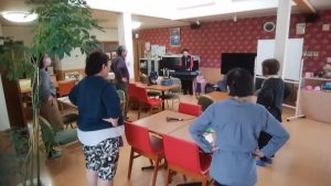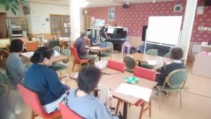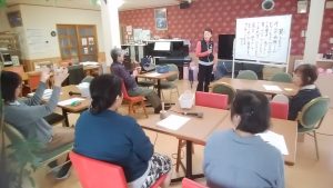 今日は、音楽療法がありました。みんなで発声練習をしたり、楽器演奏をしたり、いっしょに歌ったりしています。今日も理事長のお話や、歌詞などで、とてももりあがりました!写真を紹介します。