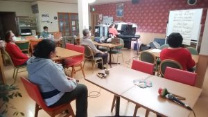 準備運動、発声、音楽療法と、