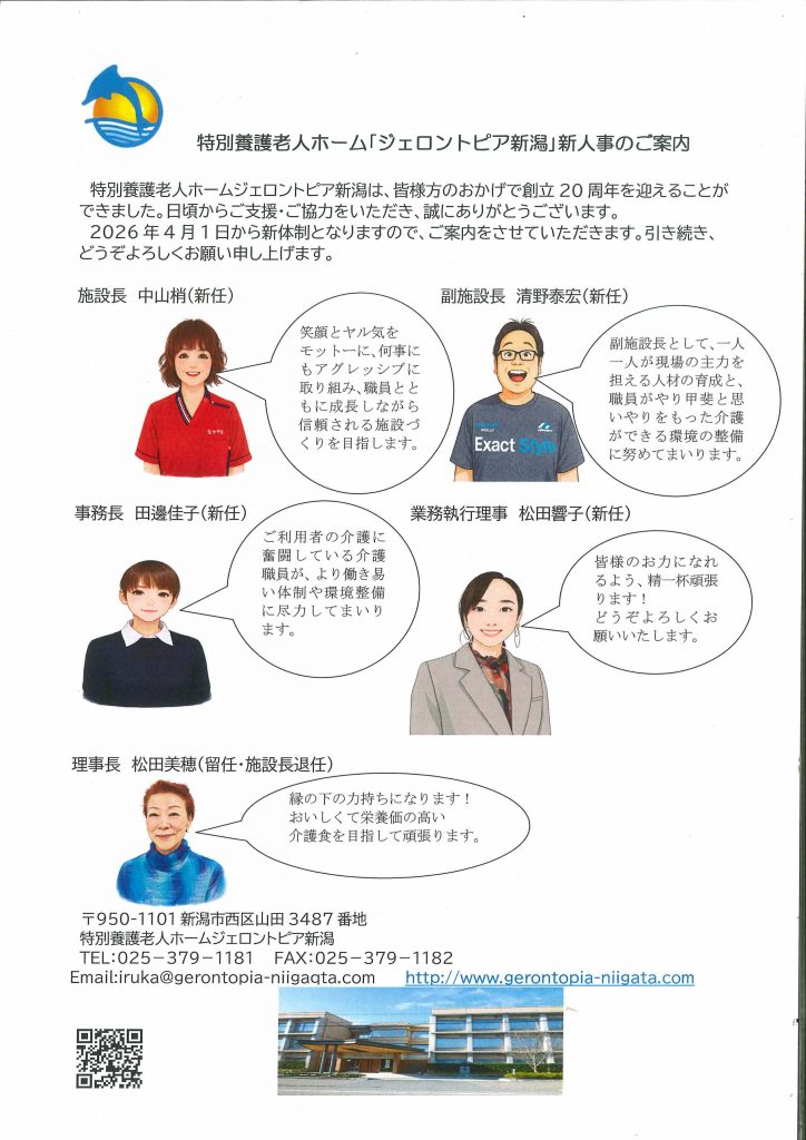 ジェロントピア新潟の新体制が4月1日から発足いたします。