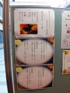 いつもありがとうございます。例年通り、ジェロントピア新潟では11月から作品展を開催しております。今年は常設展示の俳句、習字、押し花に加えて、ユニットで制作したものを展示しました。面会時に、あるいは近くに来られた際に、どうぞお越しくださいませ。