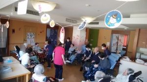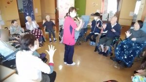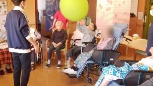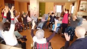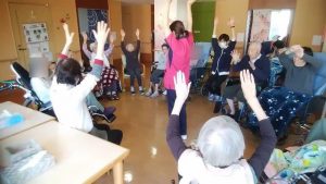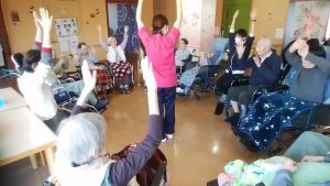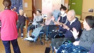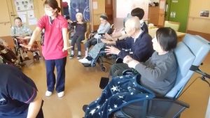 今日は、リハビリ体操がありました。(3花鳥にて) みなさん、無理のない範囲で(痛くない範囲で)、指、腕、上半身、足などを動かしています。その時に、みんなで声を出して、数え ながら取り組んでいます。今日も、みなさんの笑顔がたくさん見れてうれしいです!※ここでは、写真だけ紹介します。動画は「動画2025年10月」へどうぞ。