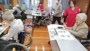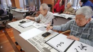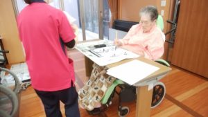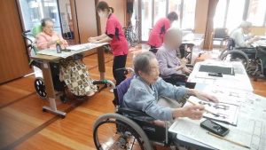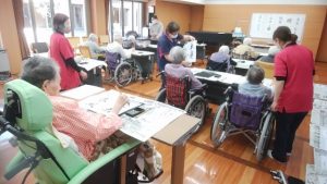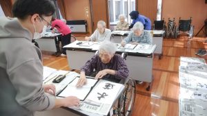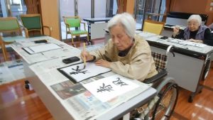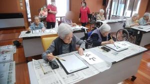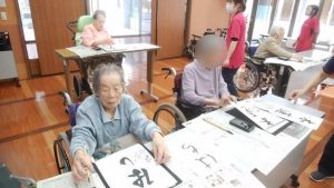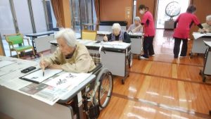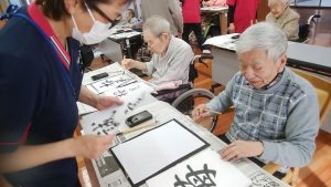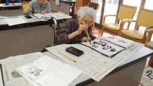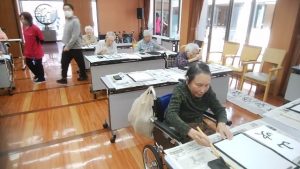今日は、書道がありました。みなさん、熱心に、何枚も書いています!お手本を選んだり、掲示用を選んだりしながら、職員や近くの方と、楽しそうにお話して今日も盛り上がっていました。今日もほぼ満席!みなさんの笑顔がたくさん見れてうれしいです!